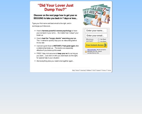 How to Get Your Ex Back Fast is backed with a 60 Day No Questions Asked Money Back Guarantee. If within the first 60 days of receipt you are not satisfied with Wake Up Lean™, you can request a refund by sending an email to the address given inside the product and we will immediately refund your entire purchase price, with no questions asked.