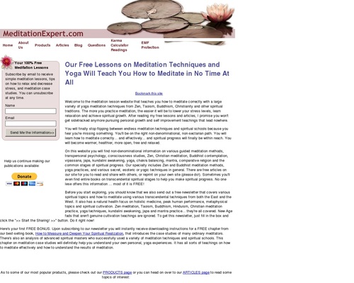 Welcome to the meditation lesson website that teaches you how to meditate correctly with a large variety of yoga meditation techniques from Zen, Taoism, Buddhism, Christianity and other spiritual traditions. The more you practice meditation, the easier it will be to lower your stress levels, learn relaxation and achieve spiritual growth. After reading my free lessons and articles, I promise you won’t get sidetracked anymore pursuing personal growth and self improvement teachings that lead nowhere.
