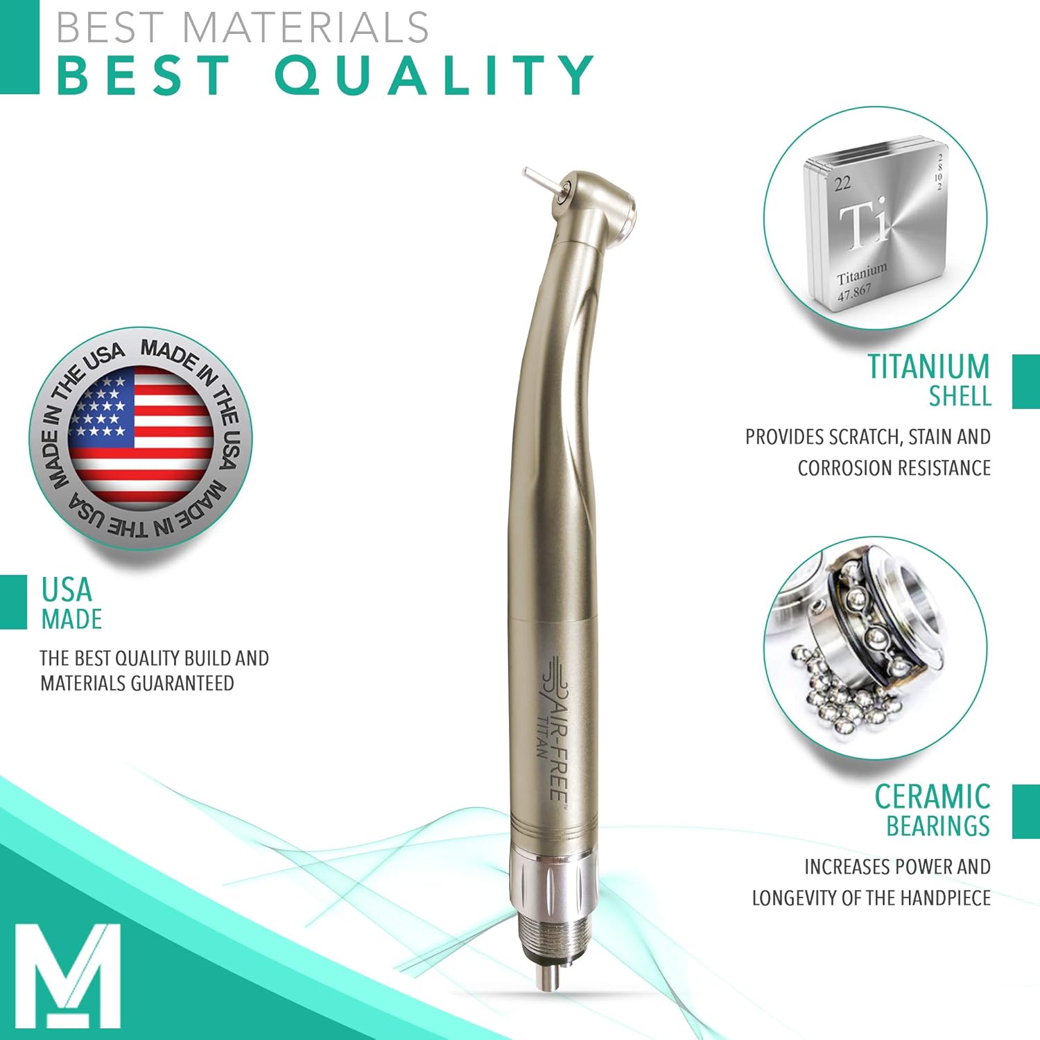 HIGHEST QUALITY MATERIALS: Titanium shell provides scratch, stain and corrosion resistance against heat sterilization. Ceramic bearings ensure that this high-speed dental handpiece outperforms even after repeated use. Made in the USA.