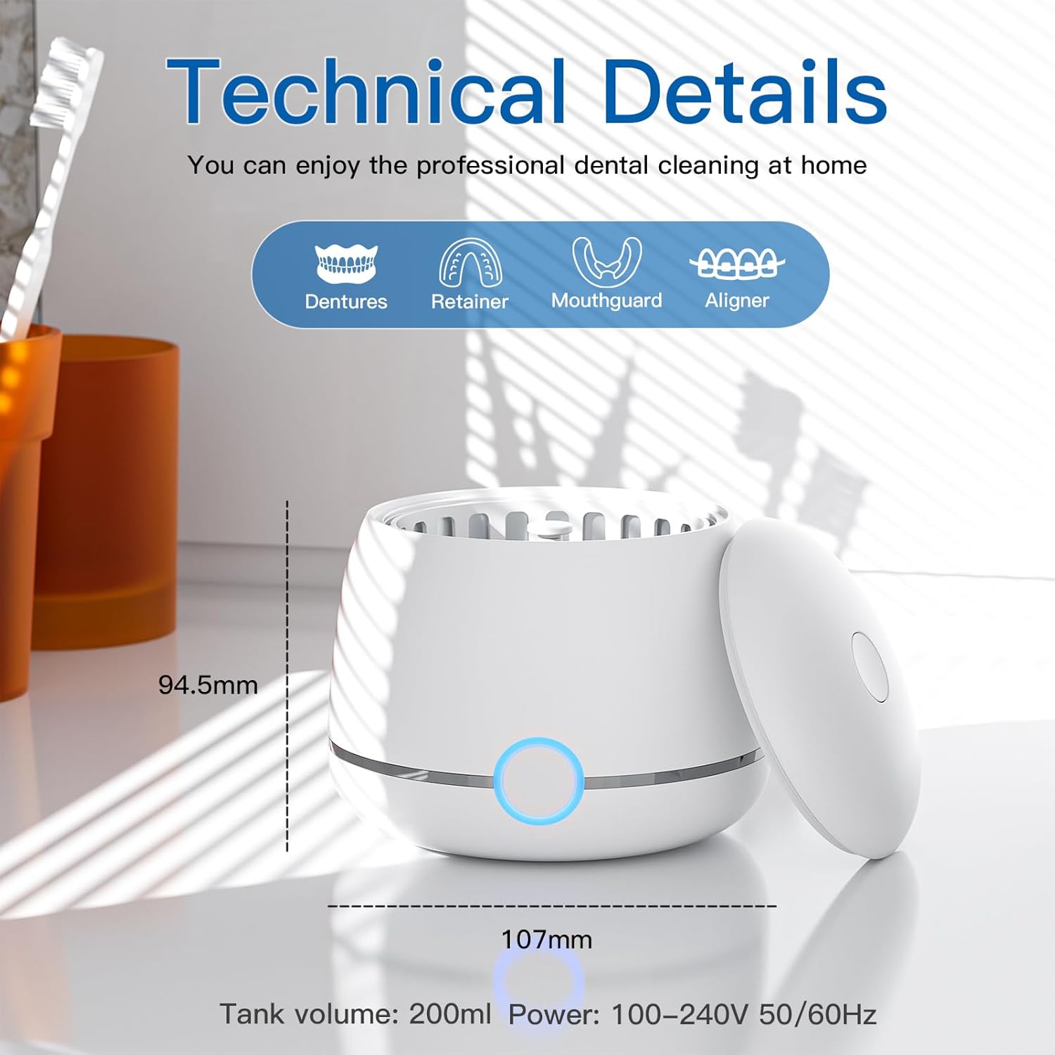 【Ultimate Portability& Utility】200ml mouth guard cleaner is made by upgraded ABS plastic casing and SUS 304 stainless steel dental cleaning pod, also boasts shock-resistant components, ensuring smooth cleaning and low noise. Small and compact design won’t take up counter space while providing a deep clean to appliances of any size, Size 4.2×4.2×3.7 in, weights 0.7 lb, 100V-240V wide voltage, easy to carry on for travel