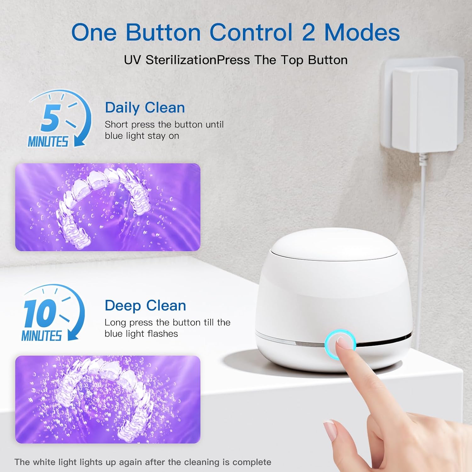 【2 Efficient Cleaning Modes】One power button control 2 ultrasonic retainer cleaner modes: One) 5 mins Daily Clean– short press til steady blue light on, Two) 10 mins Deep Clean– long press til breath blue light on. Short press the button again at any time to stop clean, and the white light will be on during standby/finish/power on