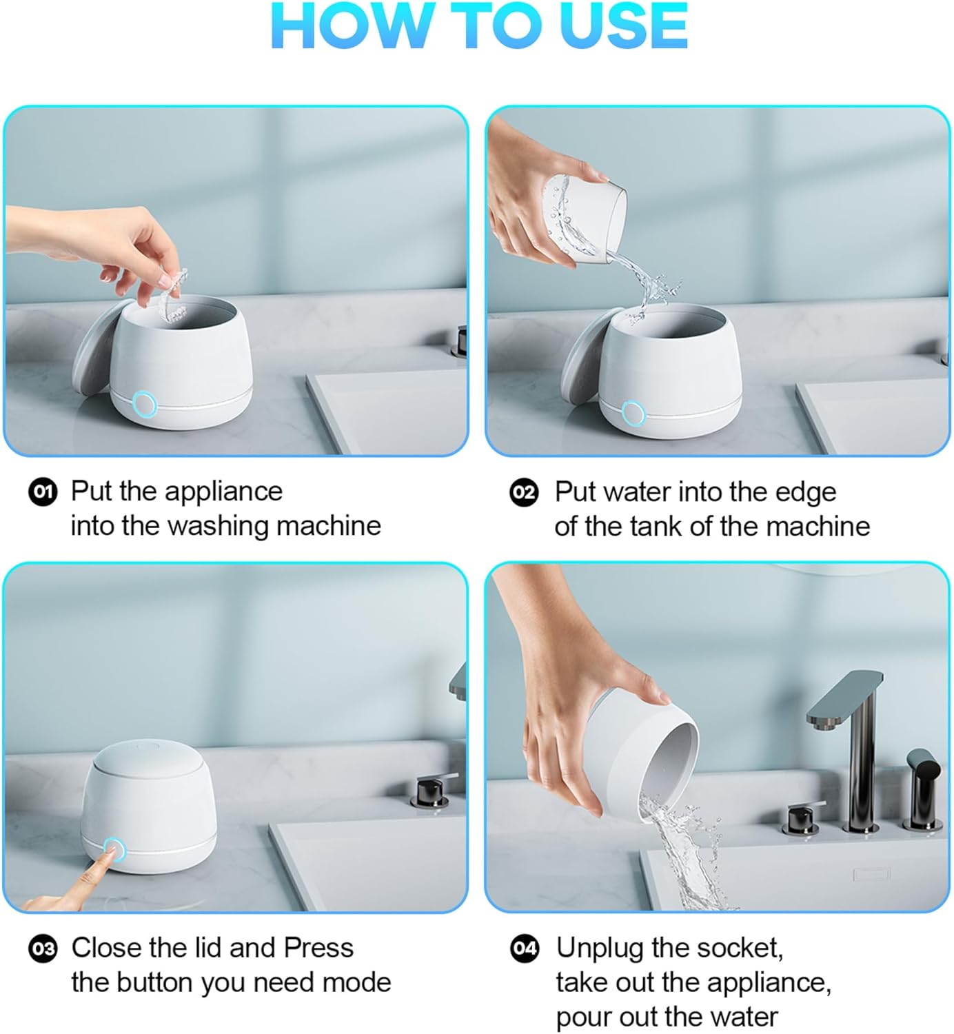 46,000Hz sound waves can access to hard-to reach areas! Cleans up cracks, dead corners, removes grease, dust or other contaminants from surfaces and cavities, keeps your denture healthy and whiter