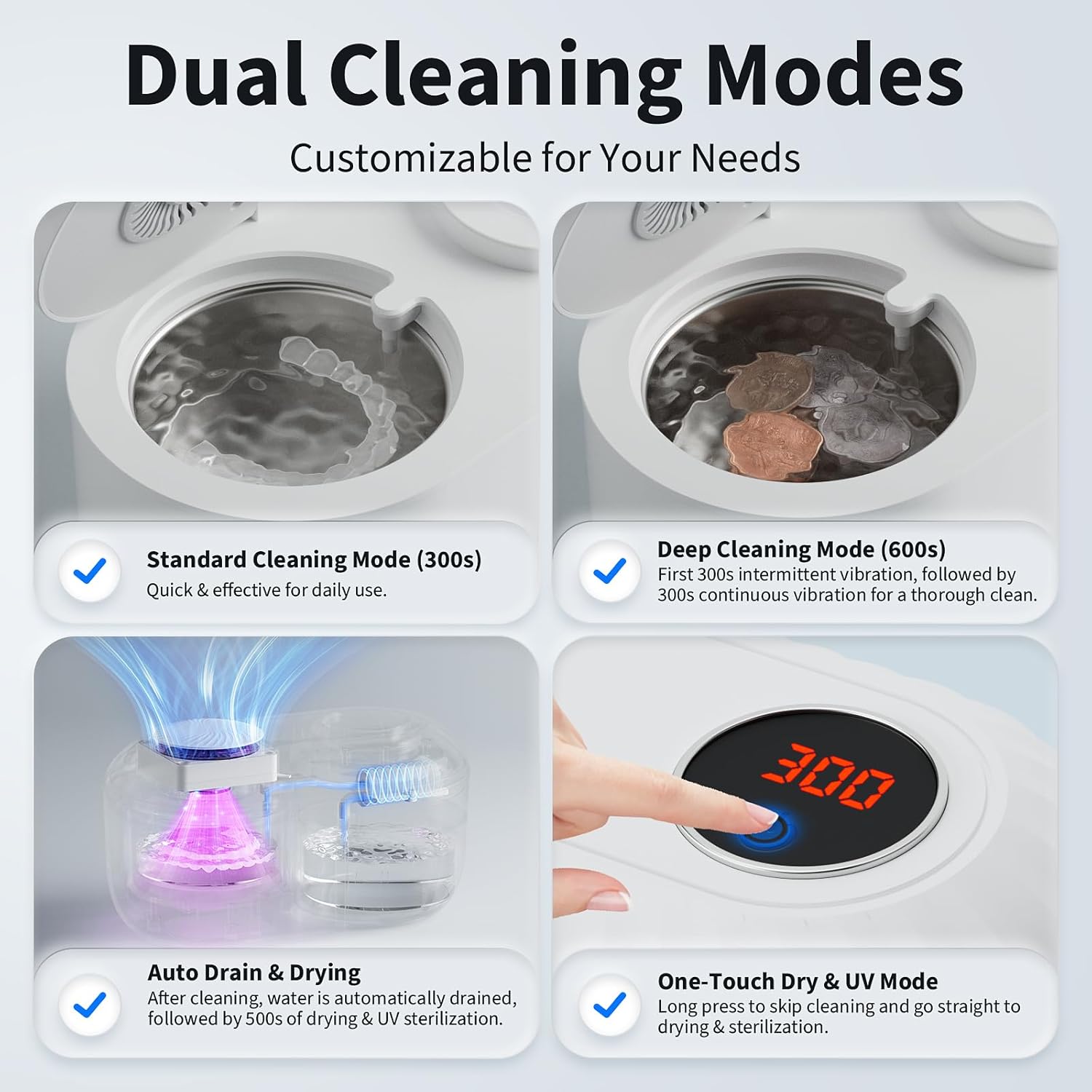 【Advanced Ultrasonic Technology】Experience the power of cutting-edge ultrasonic waves. Our denture cleaner emits high-frequency ultrasonic waves at 45 kHz to scour every inch of your retainer, mouth guard, or dental tool—penetrating tiny crevices that ordinary cleaning methods can’t touch. The result is a 360° deep clean that leaves your dental essentials spotless, all without a scratch.